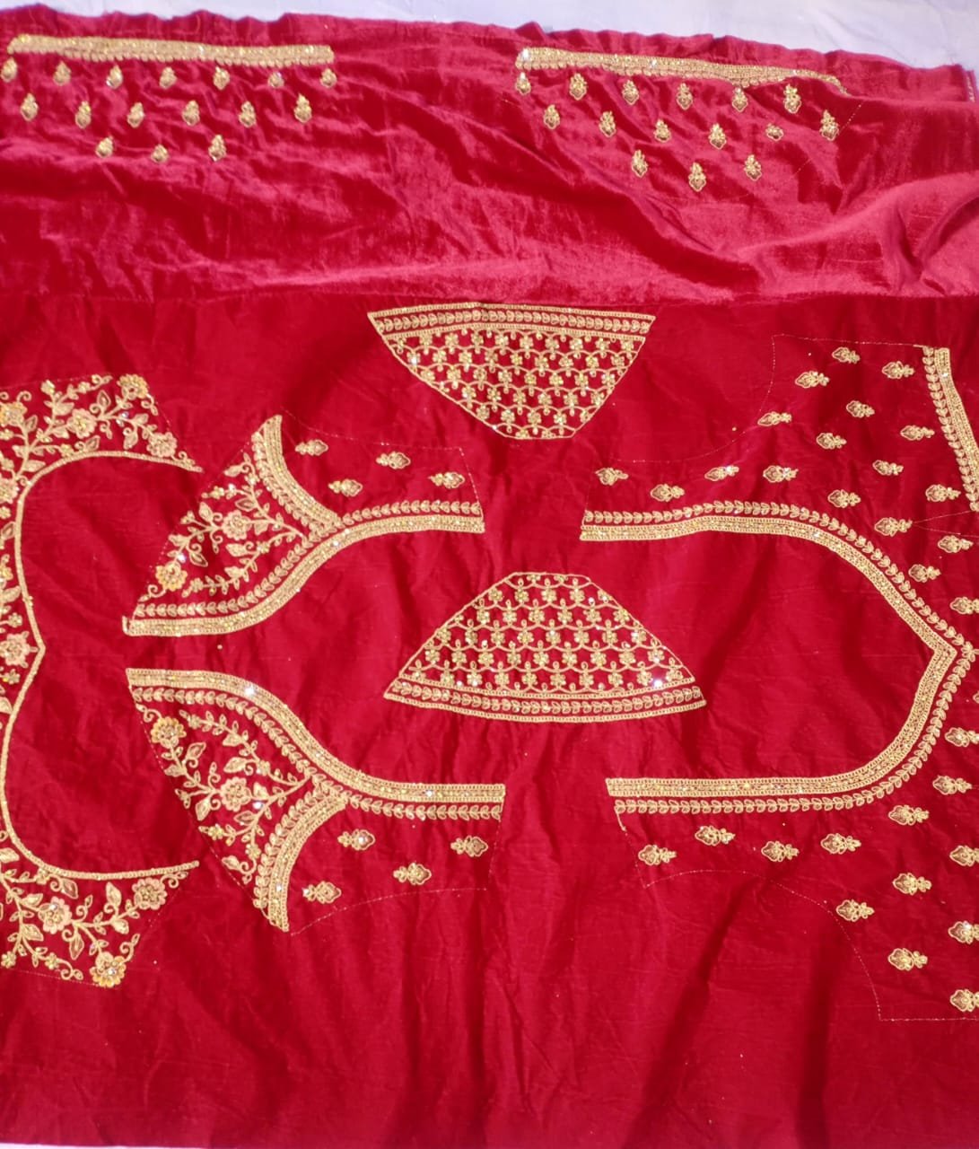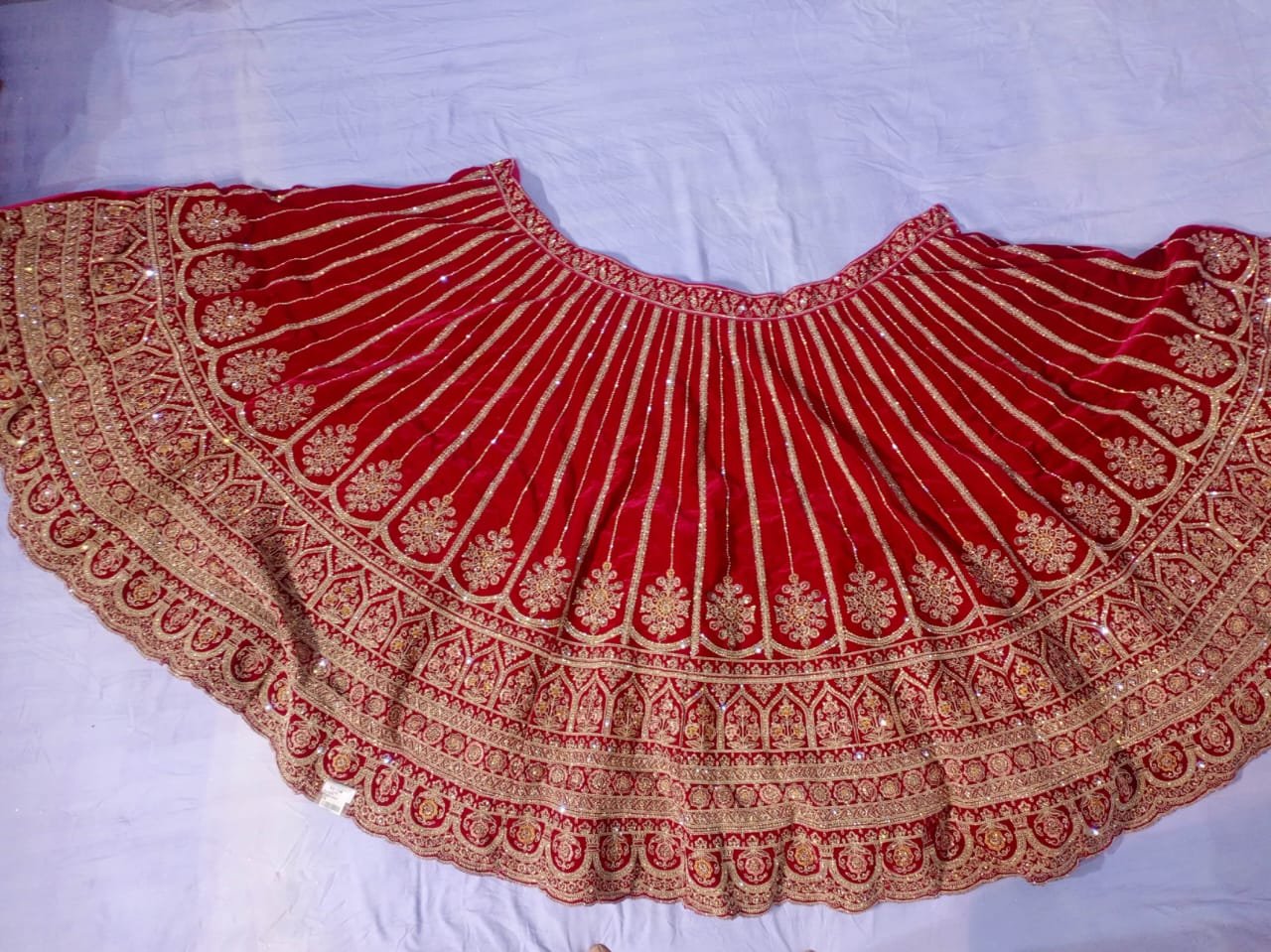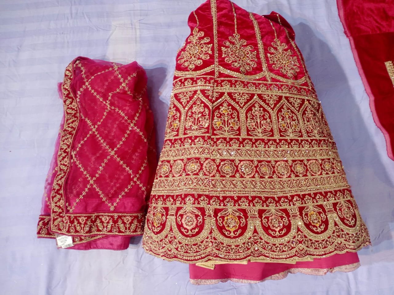 Traditional heavy bridal embroidery on lehenga, blouse pieces, and dupatta