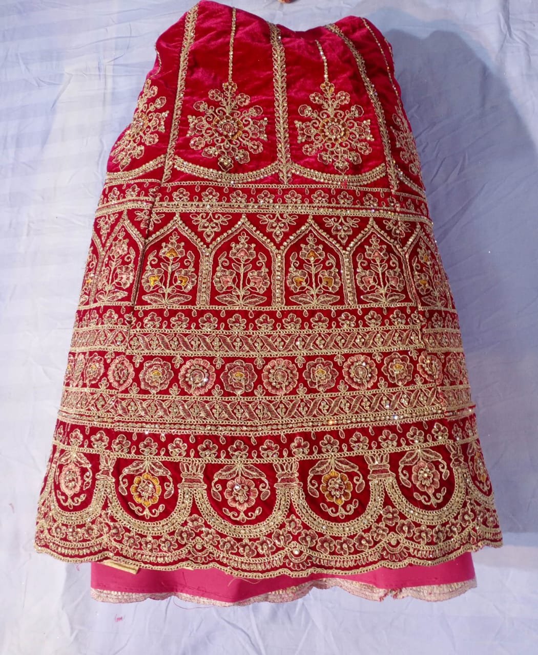Rich pink velvet base with intricate gold zari, sequin, and stone embellishments